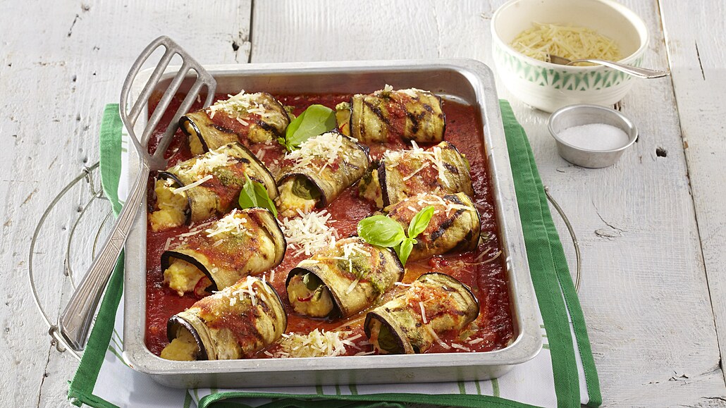 - V míse rozmícháme ricottu, parmazán, vejce, česnek a chilli. Směs osolíme. Plátky lilku potřeme olejem a po částech je opékáme na rozpálené grilovací pánvi (1-2 minuty po každé straně). Na krátký konec každého plátku dáme lžíci směsi, přidáme lístek bazalky a stočíme.