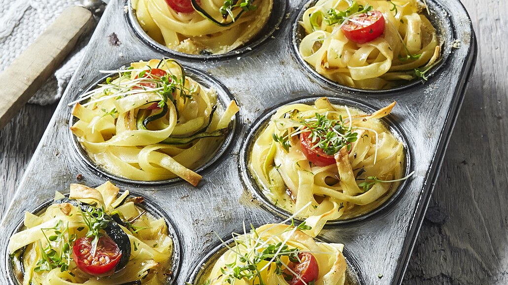 - Formu na muffiny vytřeme máslem a vysypeme strouhankou. Naplníme směsí nudlí a zeleniny. Navrch poklademe půlky rajčátek.