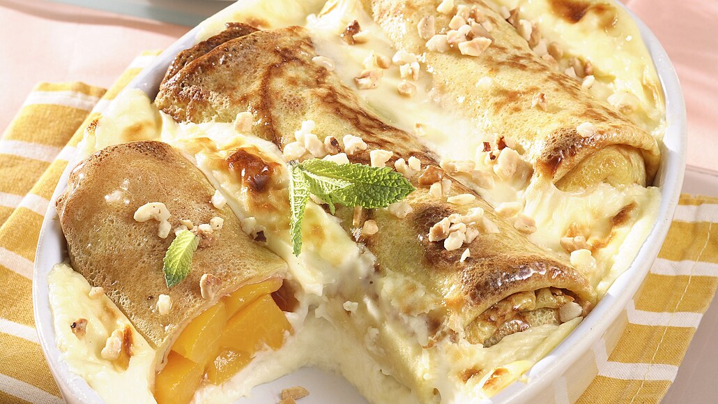 - Palačinky naskládané v misce přelijeme tvarohovou zálivkou, posypeme oříšky a zapečeme 20 minut ve vyhřáté troubě při 180 °C. Po zapečení necháme mírně vychladnout a podáváme.