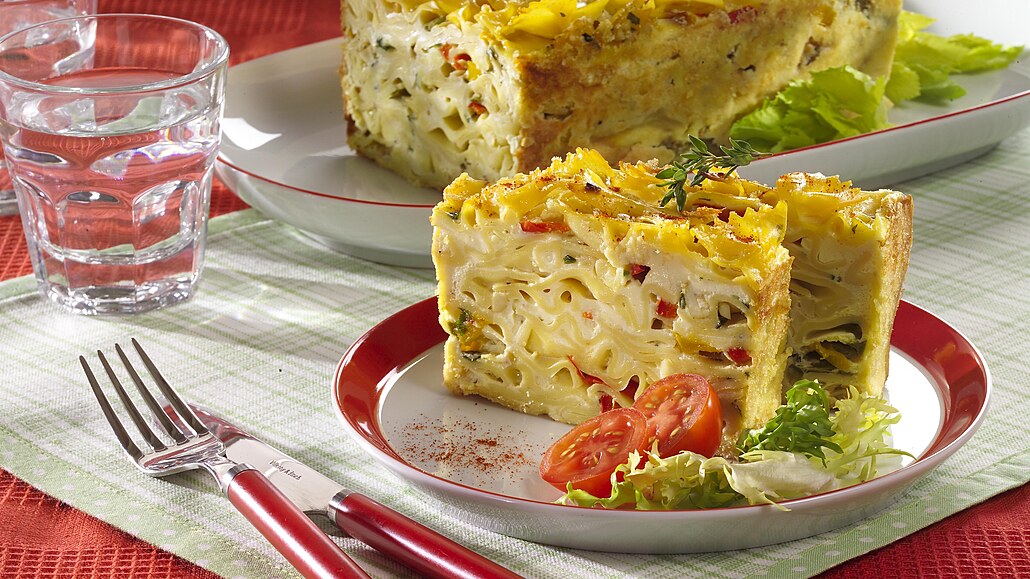 - Do misky nalijeme smetanu a rozšleháme v ní vejce. Přidáme prolisovaný česnek a sójovou omáčku. Zapékací misku vymažeme olejem a rozložíme do ní těstovinovou směs. Směs zalijeme smetanovou omáčkou. Pekáček vložíme do trouby. Těstoviny při 180 °C zapékáme asi 30 minut.