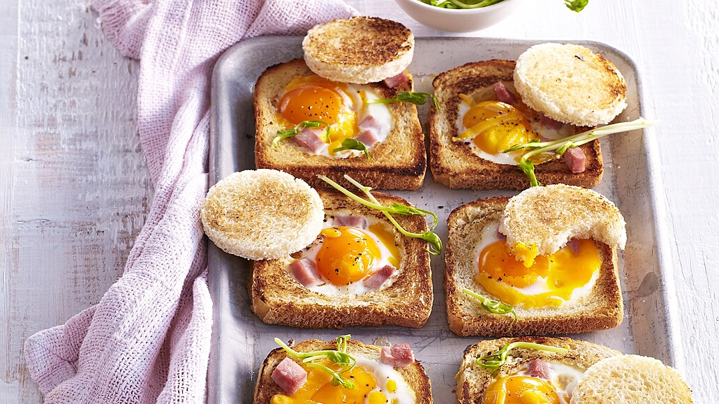 - Pečeme v troubě vyhřáté na 180 °C asi 10 minut (dle požadované tuhosti vajec). Zapečené toasty dozdobíme omytými hráškovými výhonky a vykrájenou střídkou. Podáváme např. s čajem ke snídani nebo jako malou svačinku.
