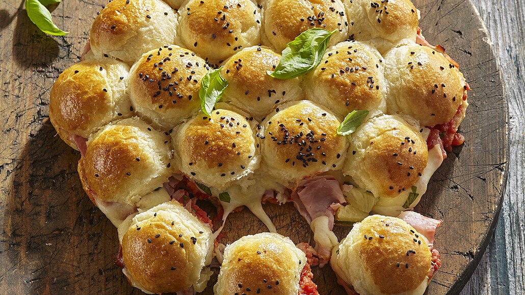 - Po upečení necháme trochu vychladnout a pak opatrně dlouhým nožem podélně rozřízneme a vršek odklopíme. Spodní díl potřeme rajčatovou passatou smíchanou s nasekanou bazalkou a trochou soli. Potom poklademe plátky šunky a poklademe mozzarellou. Jako poslední vrstvu dáme scezené kousky ananasu a přiklopíme vrškem housek. Zalijeme rozpuštěným máslem a pečeme při 180 °C asi 12-15 minut.