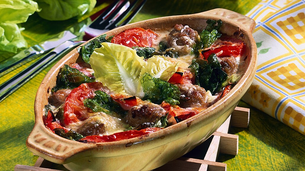 - Zapékací misky vymažeme máslem – pokud nemáme vhodnou misku, můžeme si ji zformovat z alobalu. Troubu si předehřejeme na 180 °C. Salát nakrájíme nahrubo, rozdělíme do misek a zakryjeme střídavě plátky rajčat a nočky z mletého masa, které vykrajujeme kávovou lžičkou. Zaplněné misky dáme péct do trouby.
