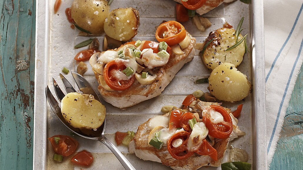 - Rajčátka, žampiony a jarní cibulku nakrájíme na plátky a poklademe jimi krůtí steaky. Přidáme máslo a nahoru nasypeme mozzarellu natrhanou na malé kousky.