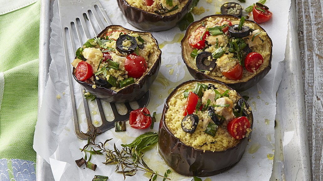 - Připravené špalíčky lilku přendáme na plech vyložený pečicím papírem vydlabanou stranou nahoru, osolíme je, naplníme směsí kuskusu, masa a zeleniny a pokapeme olivovým olejem. Pečeme v předehřáté troubě při 180 °C asi 15 minut.