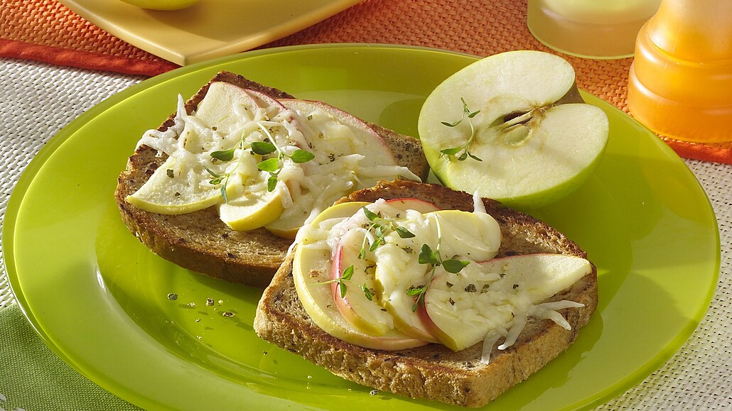 - Celozrný chléb z jedné strany na sucho opečeme. Opečenou stranu namažeme Florou, poklademe plátky jablka i se slupkou, posypeme strouhaným sýrem a vložíme do předehřáté trouby na 5 až 10 minut zapéct.