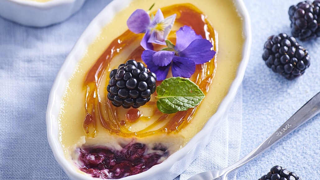 - Po vychladnutí misky uložíme alespoň na 3 hodiny do chladničky. Před podáváním každou misku ozdobíme karamelem, přidáme ostružiny a jedlé květy.