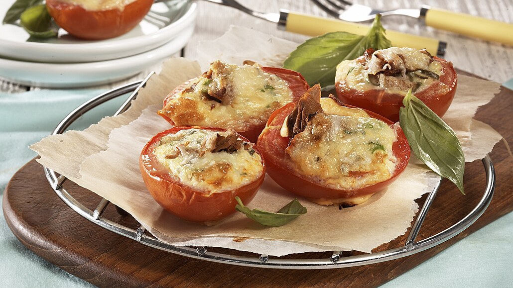 - Mističky rajčat naplníme připravenou nádivou a rozložíme na plech vyložený pečicím papírem. V troubě je při 200 °C je zapékáme zapékáme asi 10 minut.