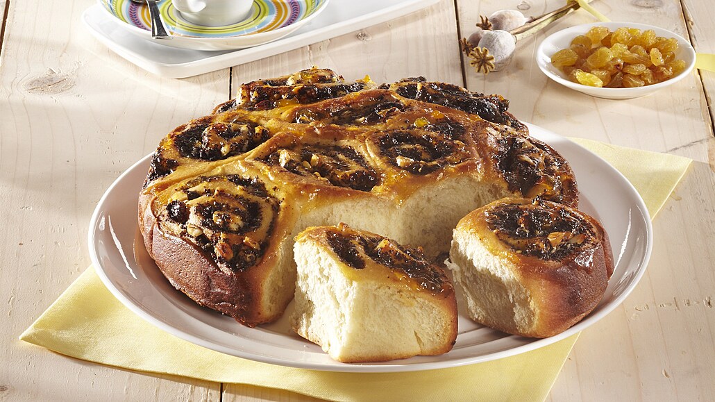 - Vykynuté těsto zlehka propracujeme a rozválíme na plát silný 1 cm. Potřeme ho makovou náplní a stočíme do rolády. Tu nakrájíme na 2 cm silné kousky a naskládáme je do formy vymazané máslem. Necháme na teplém místě 15 minut kynout a pak pečeme ve vyhřáté troubě při 180 °C asi 40 minut. Ihned po upečení potřeme meruňkovým džemem a necháme ve formě vychladnout. Pak vyklopíme.