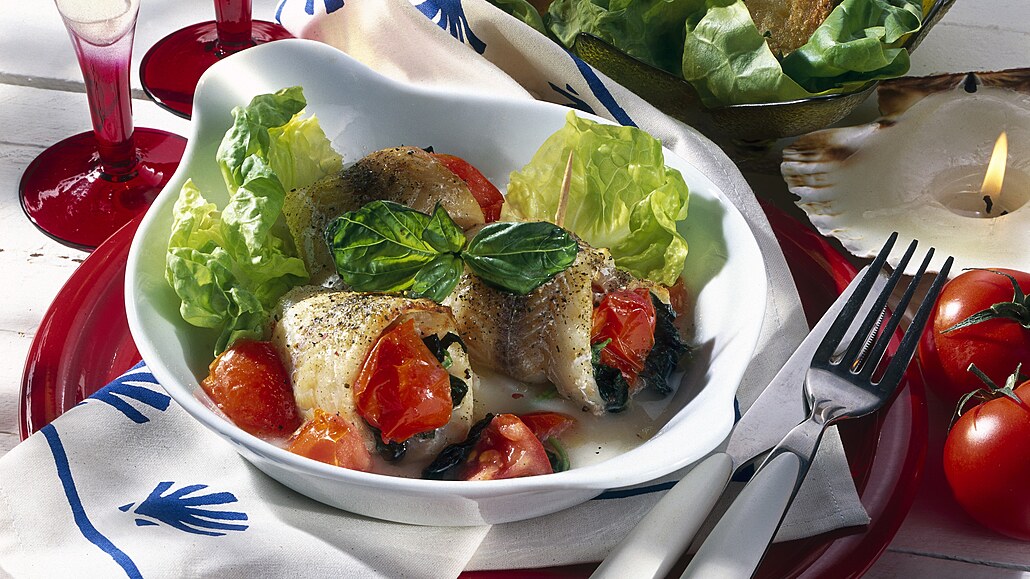 - Filé z mořské štiky opláchneme, osušíme, okořeníme rybí směsí (někdy bývá solená, takže maso již nemusíme solit). Rajčata omyjeme a nakrájíme na čtvrtky. Můžeme je před nakrájením krátce spařit v horké vodě a sloupnout. Na každou porci položíme nakrájená rajčata (na plnění závitků použijeme asi polovinu z celkového množství) a podle chuti jeden nebo několik lístků bazalky.