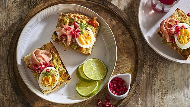 - Opečené ciabatty potřeme avokádovou směsí, přidáme vždy plátek šunky, vejce, granátové jablko, ozdobíme bylinkou a ihned podáváme.