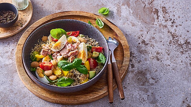 - Quinou uvaříme dle návodu, scedíme ji a přendáme do velké mísy. Přidáme na kostky pokrájenou papriku, okurku, cherry rajčata, scezené fazole a natrhané bazalkové listy. Vejce uvaříme natvrdo, oloupeme a pokrájíme na měsíčky. Do misek dáme vždy pokrájenou polovinu vejce. Druhou si necháme na dohotovení.