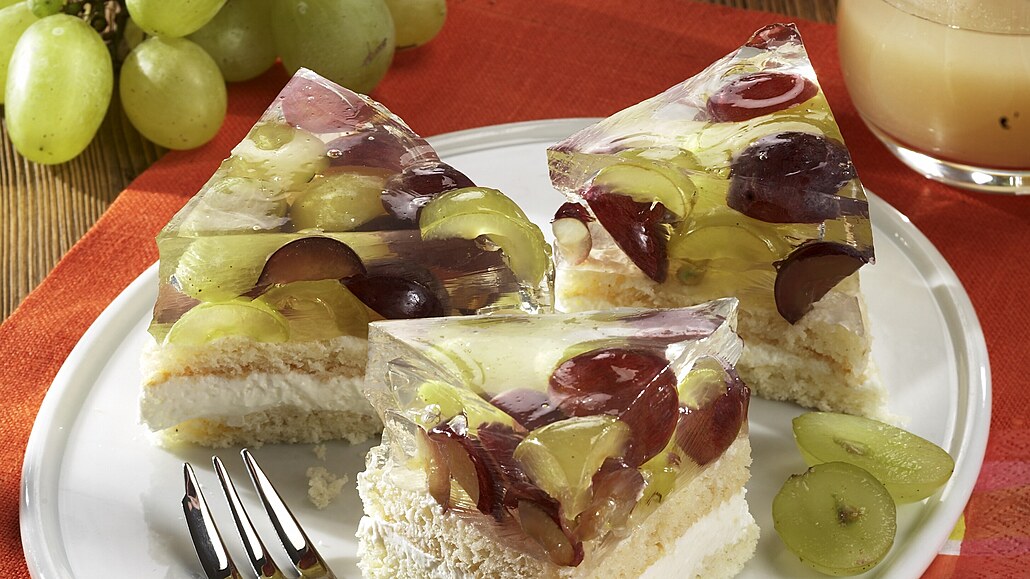 - Spodní díl korpusu vrátíme do čistého pekáčku, potřeme polovinou krému a přiklopíme vrchním dílem. Navrch rozetřeme zbylou náplň. Korpus uložíme do chladna. Když krém zatuhne, poklademe ho přepůlenými kuličkami vína a zalijeme želé připraveným dle návodu na obalu. Moučník necháme v ledničce zatuhnout.