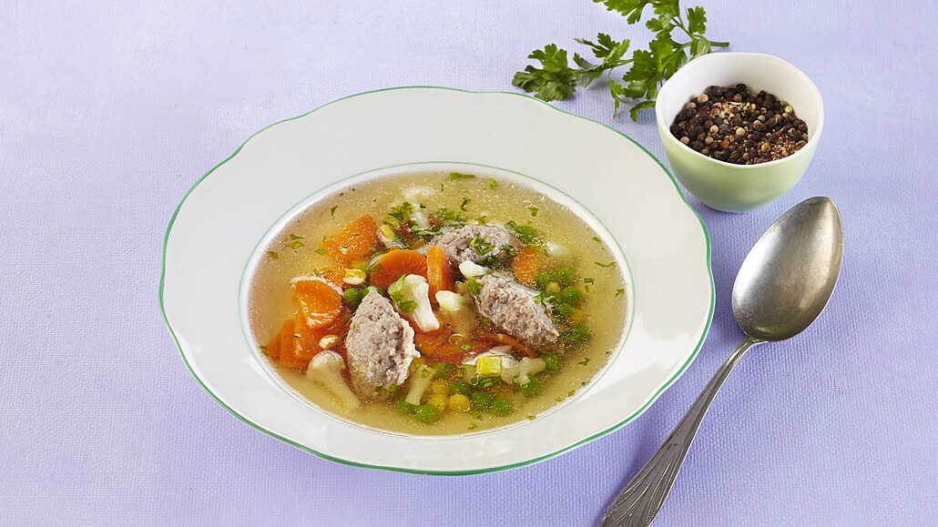 - Vývar nalijeme do hrnce, přidáme očištěnou a na kousky pokrájenou mrkev, květák rozdělený na malé růžičky, hrášek a kukuřici. Polévku přivedeme k varu a postupně do vložíme masové nočky vytvarované pomocí dvou lžic. Společně vaříme 10 minut. Hotovou polévku rozdělíme do talířů a doplníme pokrájenou petrželkou.