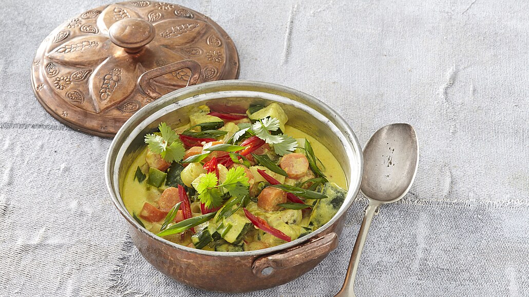 - Zeleninu ochutíme solí, pepřem a mletým kari. Vše zalijeme kokosovým mlékem. Zeleninu v omáčce dusíme už jen 5 minut. Hotové zeleninové kari na závěr posypeme nasekanou jarní cibulkou a čerstvým koriandrem. Podáváme s rýží.