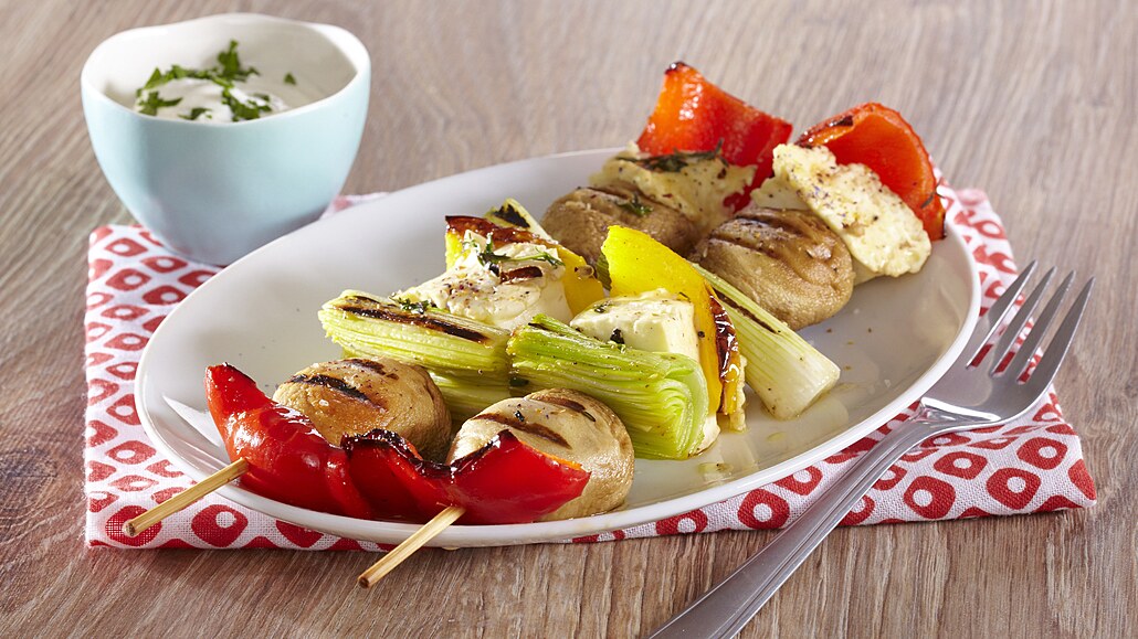 - Na 8 navlhčených špejlí střídavě napichujeme papriku, hlavičku žampionu, pórek, sýr a cibulku. Všechny špízy osolíme a opepříme, potřeme olejem a posypeme lístky tymiánu.