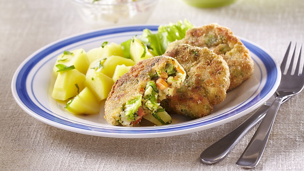 - Ze zeleninové hmoty uděláme malé karbanátky, které obalíme nejprve v rozšlehaných bílcích a pak ve strouhance. Smažíme je v rozpálené oleji po obou stranách dozlatova. Podáváme s bramborami a tatarskou omáčkou. Ozdobíme bylinkami.