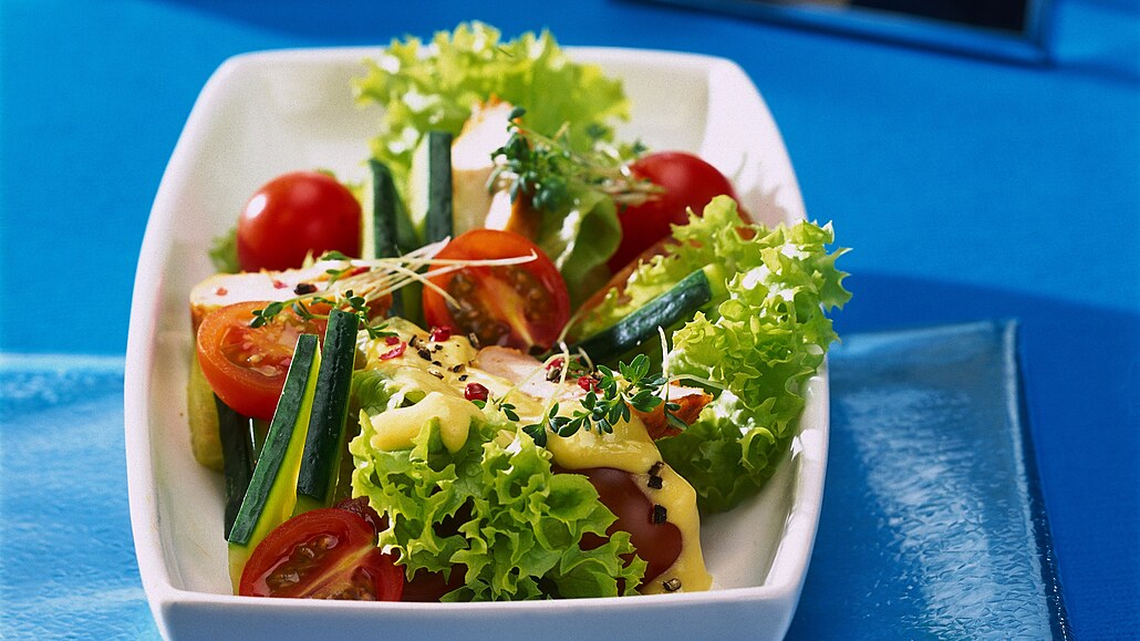 - Kuřecí maso nakrájíme na nudličky a přidáme k zelenině. Na talířích salát přelijeme bylinkovou omáčkou.