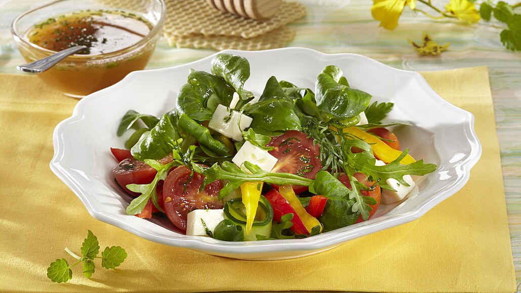- Všechnu zeleninu i kostičky sýra nasypeme do mísy a opatrně promícháme. Salát rozdělíme na talíře a zakapeme připravenou zálivkou.