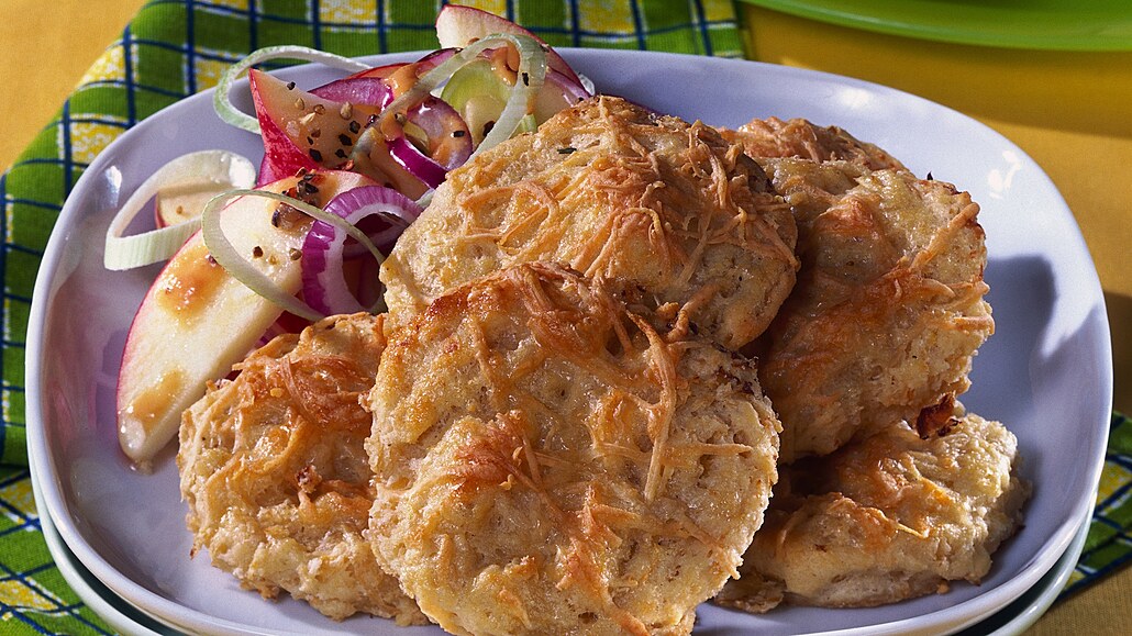 - Kuličky klademe na vymaštěný plech, lehce je rukou zploštíme, potřeme zbylým vajíčkem, posypeme strouhaným sýrem a pečeme dozlatova.