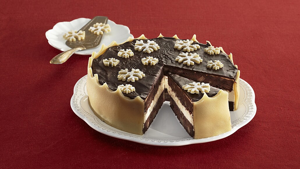 - Společně s mascarpone ji přimícháme do krému. Spodní díl dortu potřeme dvěma třetinami krému a na povrch položíme druhý korpus. Celý dort potřeme zbylým krémem a necháme zatuhnout. Polevu připravíme dle návodu a potřeme jí dort. Marcipán rozválíme na tenký plát a vykrájíme vločky. Zbylou hmotu znovu rozválíme na dlouhý úzký obdélník. Ozdobně vykrájíme horní okraj a spodní zakrojíme narovno. Stočíme ho do ruličky a obtočíme po obvodu dortu. Navrch dáme vločky a necháme ztuhnout.