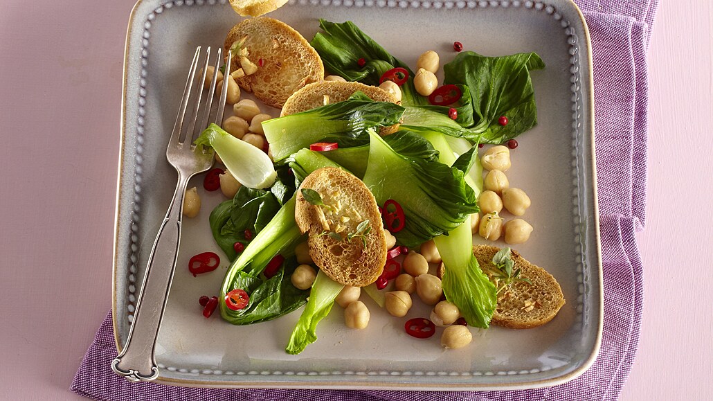 - Chilli papričky očistíme a nakrájíme na tenká kolečka. Orestujeme je společně s cizrnou v pánvi na troše oleje. Dochutíme solí a pepřem. Listy mangoldu rozdělíme na talíře a doplníme cizrnou, chilli papričkami a bagetkami.