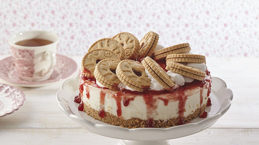- Nalijeme do formy a necháme ztuhnout v ledničce. Hotový dort potřeme džemem, ozdobíme šlehačkou a sušenkami.