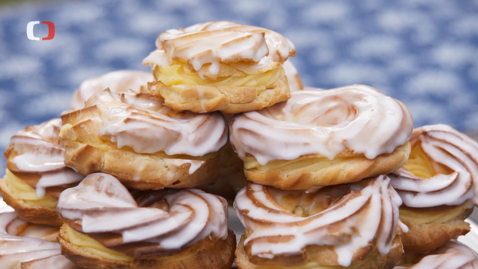 Pak už vychladlé věnečky podélně prokrojíme a naplníme krémem. Vršky namočíme do polevy, necháme okapat a přiložíme navrch na žloutkový krém.