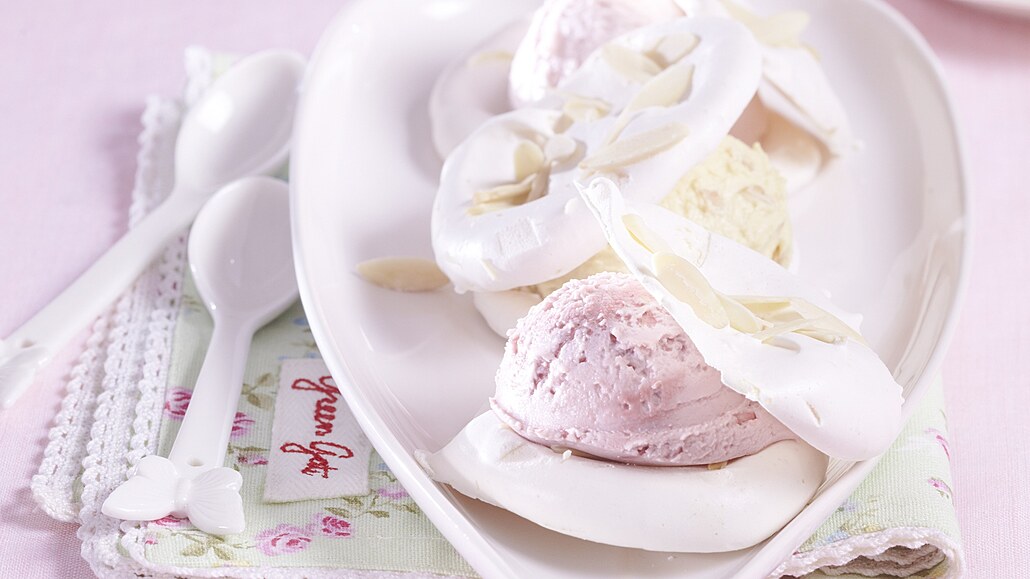- Z bílků a špetky soli vyšleháme pevný sníh. Ke konci šlehání přidáváme postupně cukr. Sněhovou hmotu klademe lžící na plech vyložený pečicím papírem a stěrkou každou hromádku rozetřeme na placičku o průměru asi 8 cm. Povrch placiček posypeme plátky mandlí.
