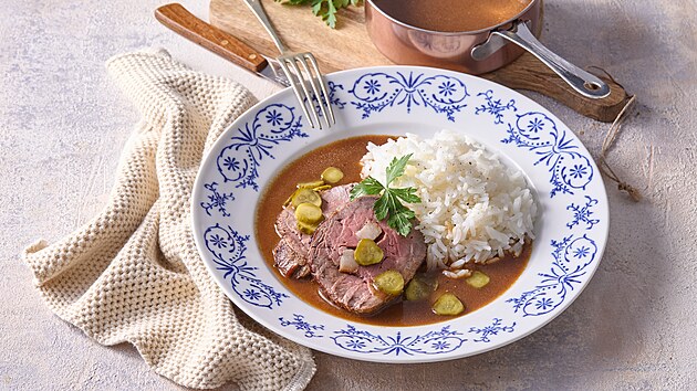 - Hotové maso vyjmeme a omáčku podle potřeby dochutíme, můžeme přidat trochu nálevu z okurek, vyjmeme bobkový list a koření. Podáváme s rýží.