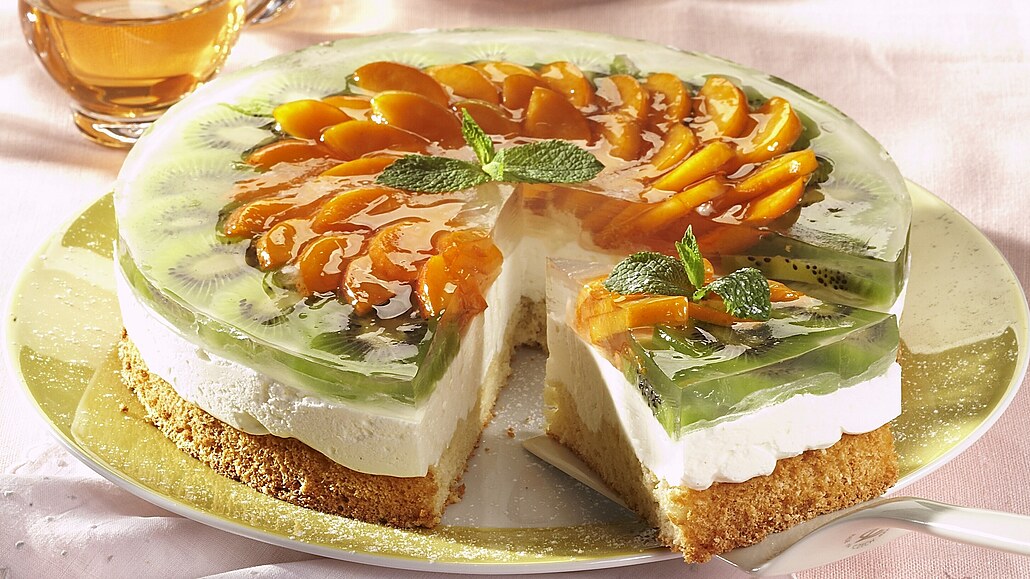 - Kiwi oloupeme, meruňky omyjeme a vypeckujeme. Ovoce nakrájíme na plátky, rozložíme na zatuhlý krém a přelijeme dortovým želé připraveným dle návodu na obalu.