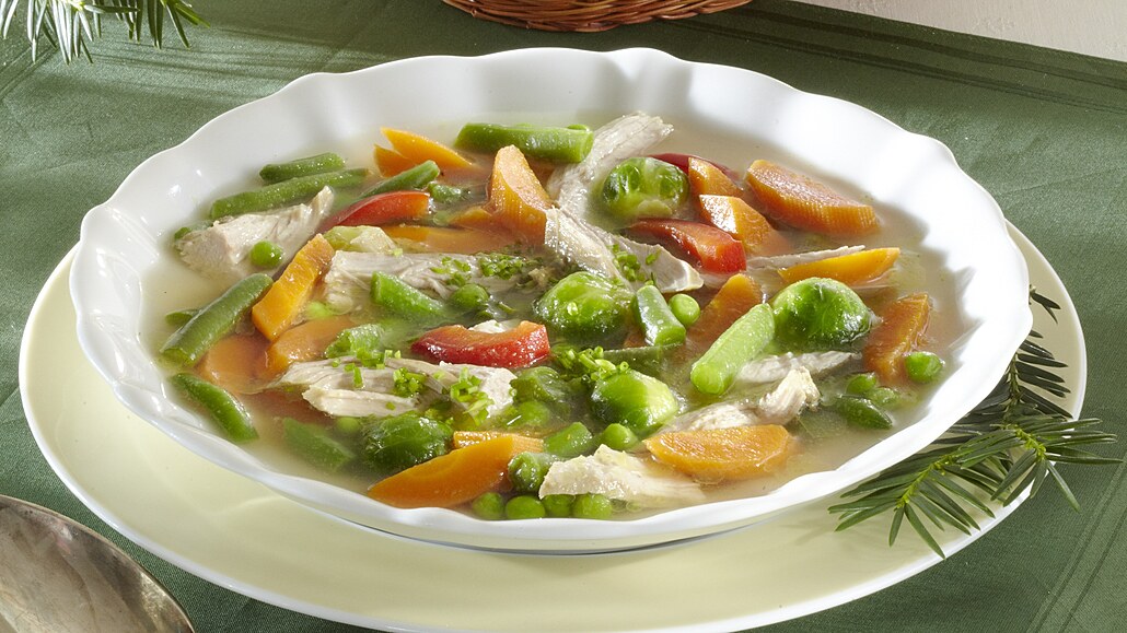 - Do vroucího vývaru vsypeme mrkev s kapustičkami a asi 5 minut je povaříme. Pak přidáme petržel, papriku, hrášek, fazolky a pokrájené maso. Polévku prohřejeme, dochutíme solí a pepřem a odstavíme.